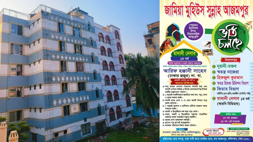 রাজধানী উত্তরার আজমপুর এলাকায় দ্বীনি ও আধুনিক শিক্ষার এক অনন্য সমন্বয় নিয়ে দাঁড়িয়ে আছে ‘জামিয়া মুহিউস সুন্নাহ আজমপুর’। নিজস্ব ছয় তলা বিশিষ্ট সুবিশাল ভবন ও মনোরম পরিবেশে পরিচালিত এই প্রতিষ্ঠানটি দীর্ঘ দিন ধরে মাদানী নেসাব ও দরসে নেজামীর এক নির্ভরযোগ্য নাম হিসেবে পরিচিতি লাভ করেছে। ১৪৪৭-৪৮ হিজরি শিক্ষাবর্ষ উপলক্ষে প্রতিষ্ঠানটিতে শুরু হয়েছে নতুন ছাত্র ভর্তি কার্যক্রম।