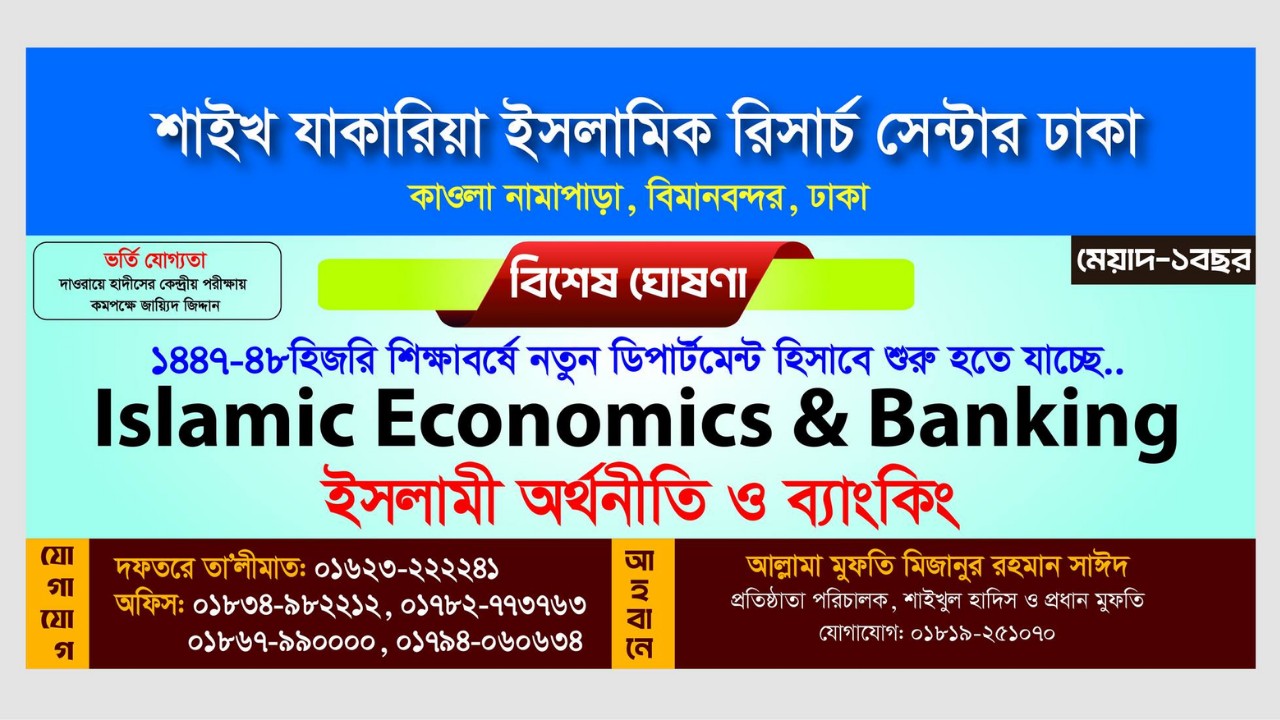 সমকালীন বৈশ্বিক অর্থনীতির প্রেক্ষাপটে দক্ষ আলেম ও গবেষক তৈরির লক্ষ্যে রাজধানীর কাওলা নামাপাড়ায় অবস্থিত দেশের অন্যতম শীর্ষ দ্বীনি উচ্চশিক্ষা ও গবেষণা প্রতিষ্ঠান 'শাইখ যাকারিয়া ইসলামিক রিসার্চ সেন্টার ঢাকা'-তে নতুন ডিপার্টমেন্ট হিসেবে ‘Islamic Economics & Banking’ (ইসলামী অর্থনীতি ও ব্যাংকিং) চালু করা হয়েছে। ১৪৪৭-৪৮ হিজরি (২০২৬-২৭ ইংরেজি) শিক্ষাবর্ষের জন্য থেকে এই বিশেষায়িত বিভাগে ছাত্র ভর্তি নেওয়া হচ্ছে।