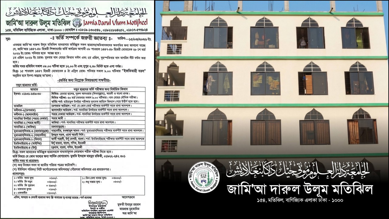 রাজধানী ঢাকার প্রাণকেন্দ্র মতিঝিলে অবস্থিত ঐতিহ্যবাহী জামিআ দারুল উলূম মতিঝিল মাদরাসায় আজ শনিবার (২৮ মার্চ) থেকে ভর্তি শুরু হচ্ছে। চলবে ৩১ মার্চ মঙ্গলবার পর্যন্ত।