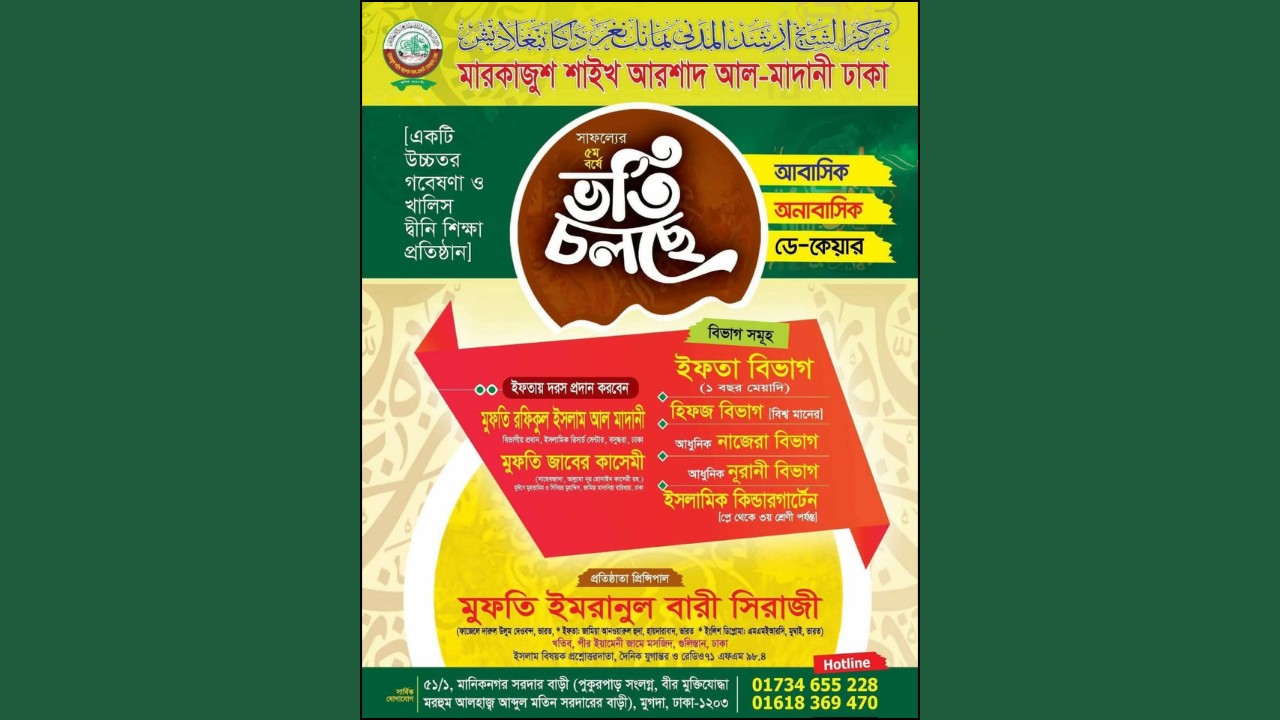 উচ্চতর গবেষণা ও খালিস দ্বীনি শিক্ষার লক্ষ্যে পরিচালিত প্রতিষ্ঠান মারকাজুশ শাইখ আরশাদ আল-মাদানী, ঢাকাতে নতুন শিক্ষাবর্ষে ভর্তি কার্যক্রম শুরু হয়েছে। প্রতিষ্ঠানটি সাফল্যের ৫ম বর্ষে পদার্পণ করেছে বলে জানিয়েছে প্রতিষ্ঠানটির সভাপতি আলহাজ্ব সৈয়দ জহির উদ্দিন।