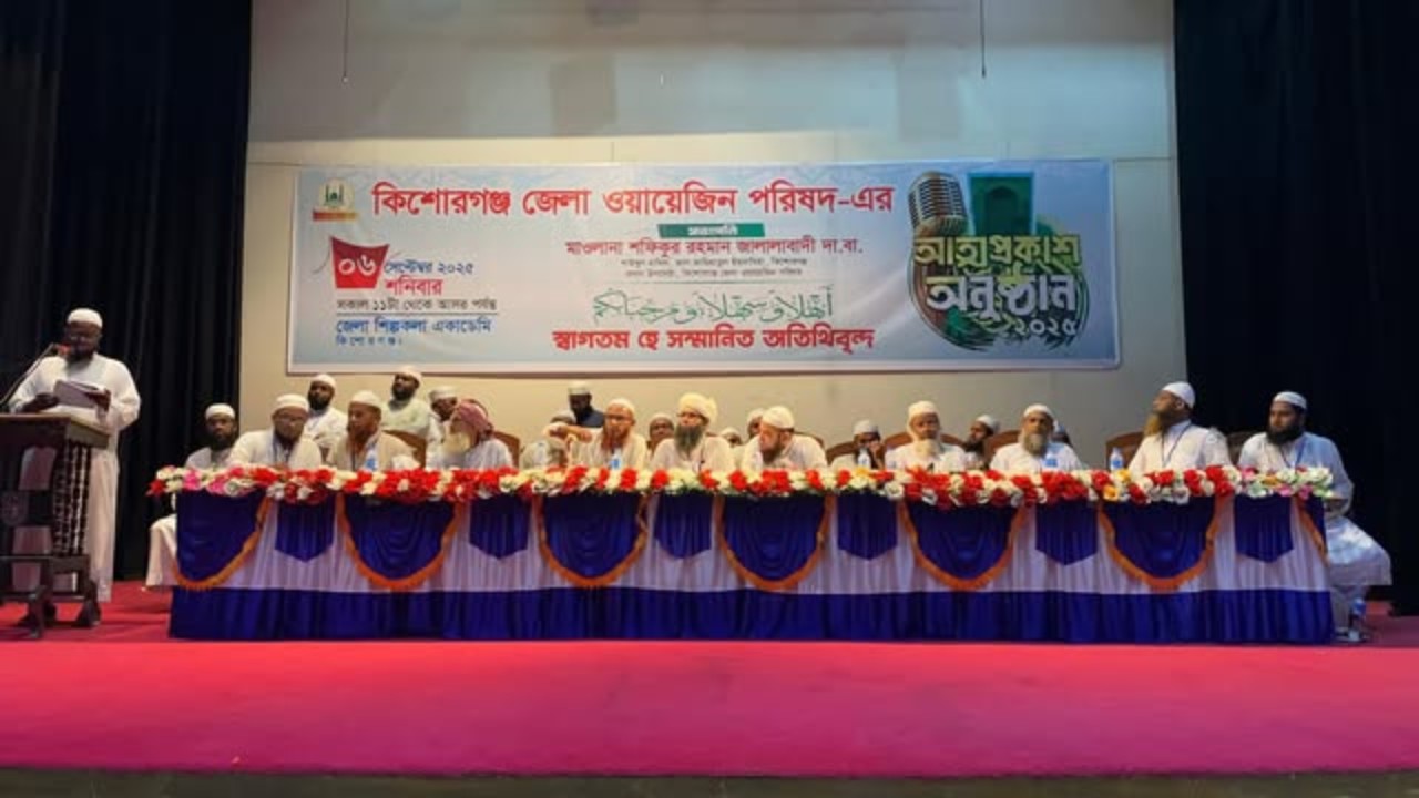 কিশোরগঞ্জে শনিবার (৬ সেপ্টেম্বর) জেলা শিল্পকলা একাডেমিতে আনুষ্ঠানিকভাবে আত্মপ্রকাশ করেছে কিশোরগঞ্জ জেলা ওয়ায়েজিন পরিষদ। সংগঠনটির মূল লক্ষ্য হলো জেলার সকল ওয়ায়েজ, কোরআনের মুফাসসির ও ধর্মীয় আলোচকদের ঐক্যবদ্ধ করে একটি সমন্বিত প্ল্যাটফর্ম গঠন করা, যাতে তারা সম্মিলিতভাবে সমাজ ও ধর্মের কল্যাণে কার্যকর ভূমিকা রাখতে পারেন।