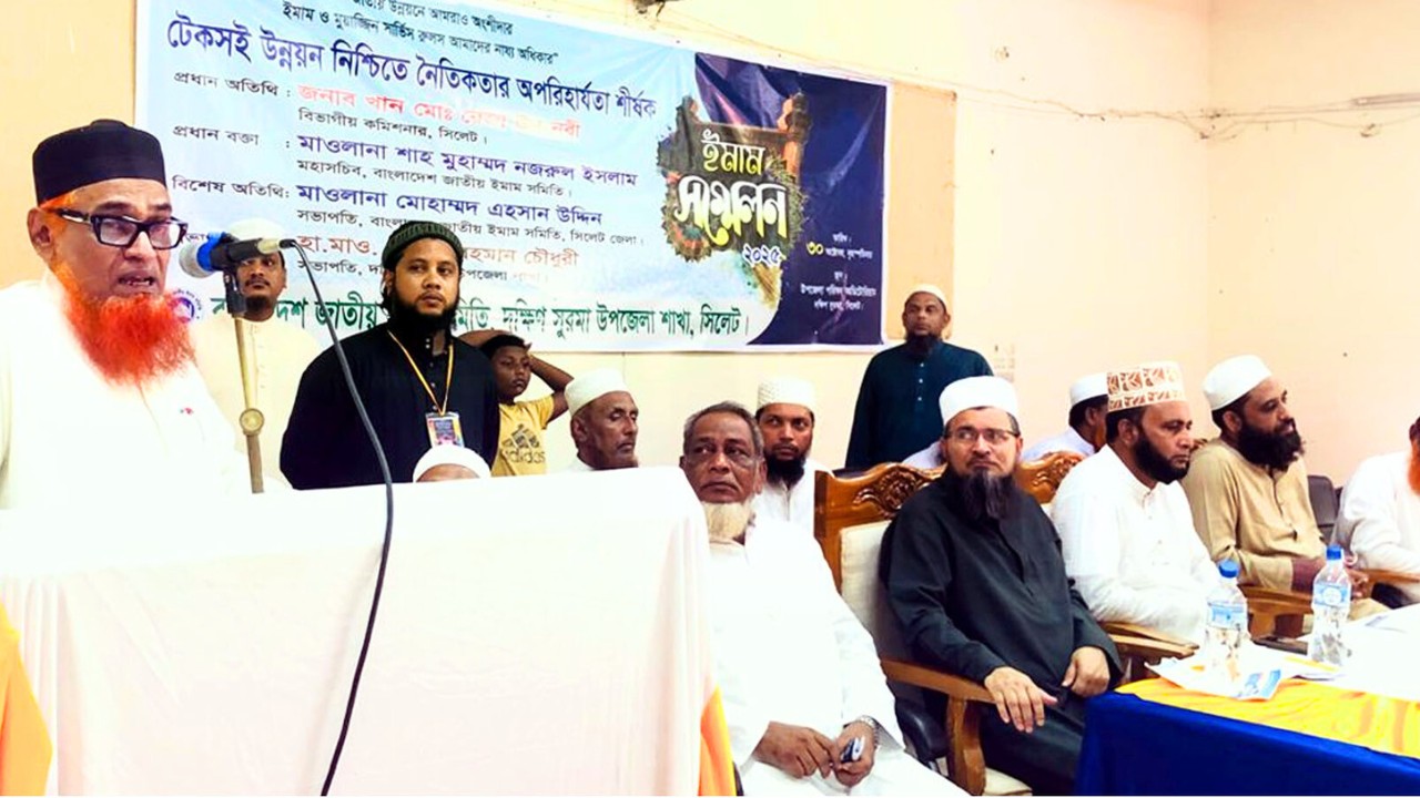 বাংলাদেশ জাতীয় ইমাম সমিতি সিলেট জেলার দক্ষিণ সুরমা উপজেলা শাখার উদ্যোগে “টেকসই উন্নয়ন নিশ্চিতে নৈতিকতার অপরিহার্যতা” শীর্ষক ইমাম সম্মেলন-২০২৫ অনুষ্ঠিত হয়েছে।
