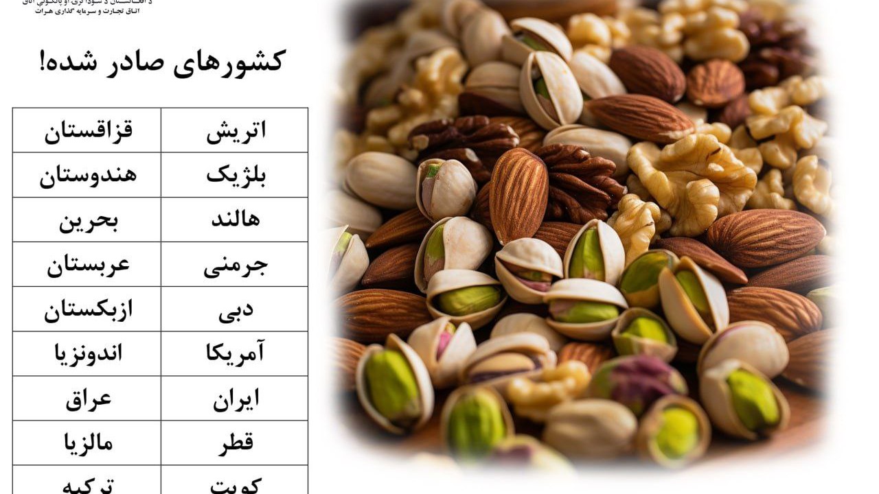হেরাতের গভর্নরের মুখপাত্র ইউসুফ সাঈদী হাফিযাহুল্লাহ জানান, চলতি বছরের প্রথম সাত মাসে হেরাত থেকে বিশ্ববাজারে শুকনো ফলের রপ্তানি উল্লেখযোগ্য হারে বৃদ্ধি পেয়েছে। এই সময়ে অস্ট্রিয়া, বেলজিয়াম, কানাডা, নেদারল্যান্ডস, জার্মানি, যুক্তরাষ্ট্র, ইরান, কাতার, তুরস্ক, ভারত ও সৌদি আরবসহ ২০টিরও বেশি দেশে ১ কোটি ৯৯ লাখ ৭০ হাজার কেজির বেশি শুকনো ফল রপ্তানি করা হয়েছে।