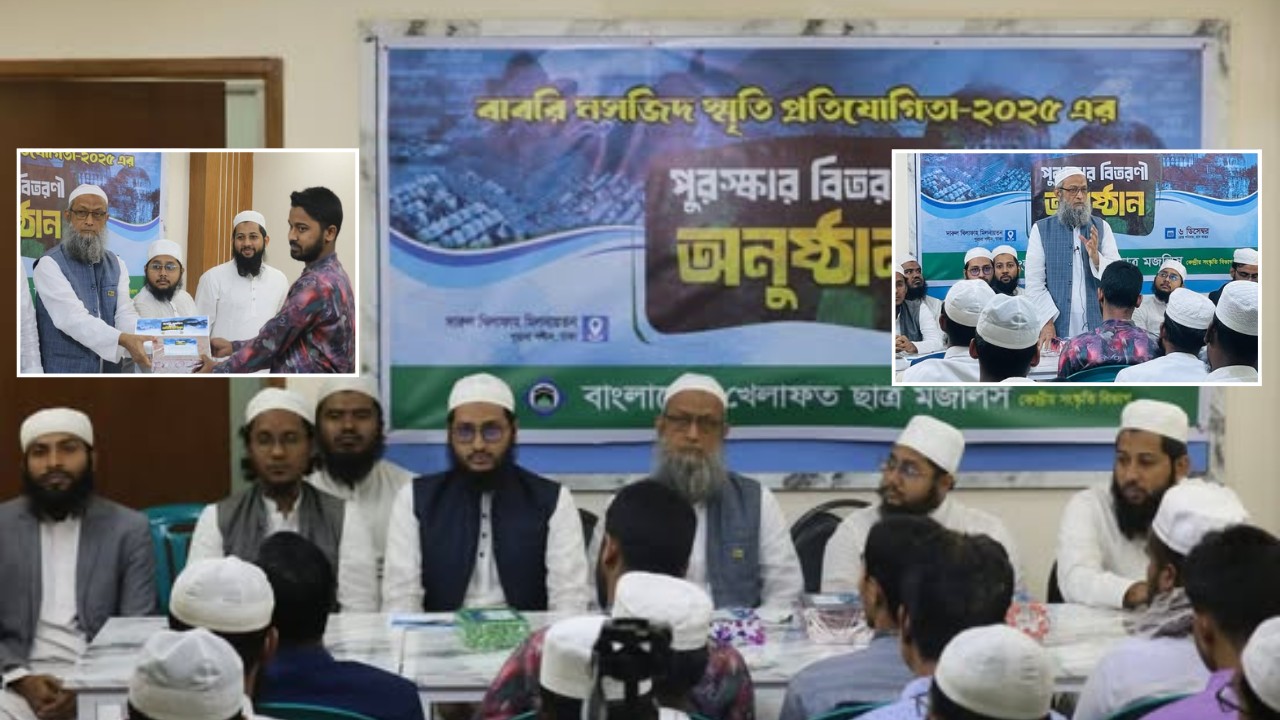 বাংলাদেশ খেলাফত ছাত্র মজলিস আয়োজিত ‘বাবরি মসজিদ স্মৃতি প্রতিযোগিতা–২০২৬’ এর পুরস্কার বিতরণী অনুষ্ঠান শনিবার (৬ ডিসেম্বর) বাদ মাগরিব দারুল খিলাফাহ মিলনায়তন, পুরানা পল্টনে অনুষ্ঠিত হয়।
