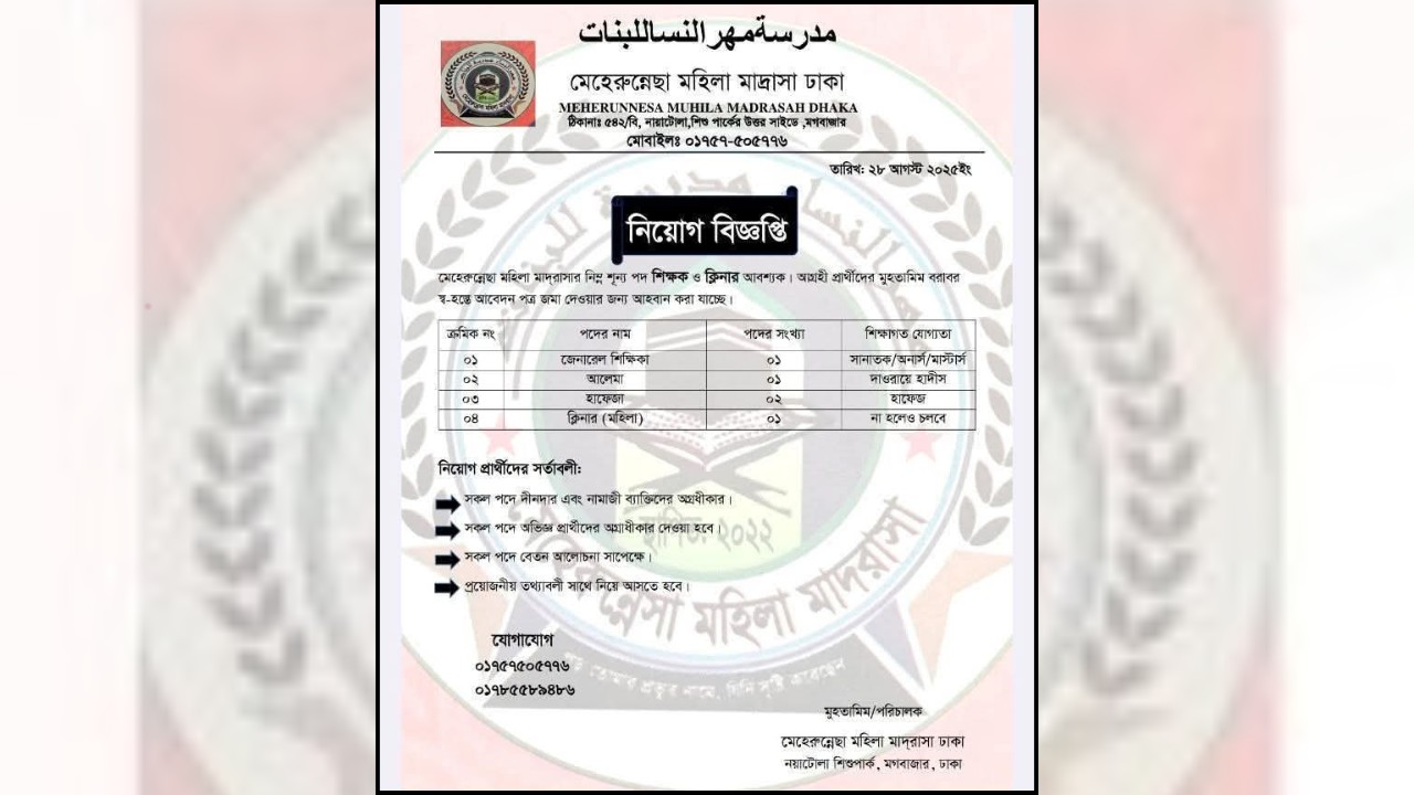 মেহেরুন্নেছা মহিলা মাদ্রাসা, ঢাকা, নতুন শিক্ষক এবং ক্লিনার নিয়োগের জন্য একটি বিজ্ঞপ্তি প্রকাশ করেছে। প্রতিষ্ঠানটি স্থানীয়ভাবে শিক্ষার মান উন্নয়ন এবং পরিষ্কার-পরিচ্ছন্নতার কাজ পরিচালনার জন্য যোগ্য প্রার্থী নিয়োগ দিতে চাচ্ছে।