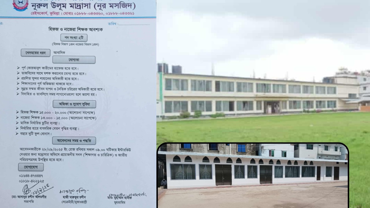 কুমিল্লা জেলার রেইসকোর্সে অবস্থিত নূরুল উলূম (নূর মসজিদ) মাদ্রাসায় হিফজ ও নাজেরা বিভাগে অভিজ্ঞ দুইজন আবাসিক শিক্ষক নিয়োগ দেওয়া হবে। মাদরাসার মুতাওয়াল্লী হাজী মারুফুর রশীদ স্বাক্ষরিত এক বিজ্ঞপ্তিতে এ তথ্য জানানো হয়েছে।