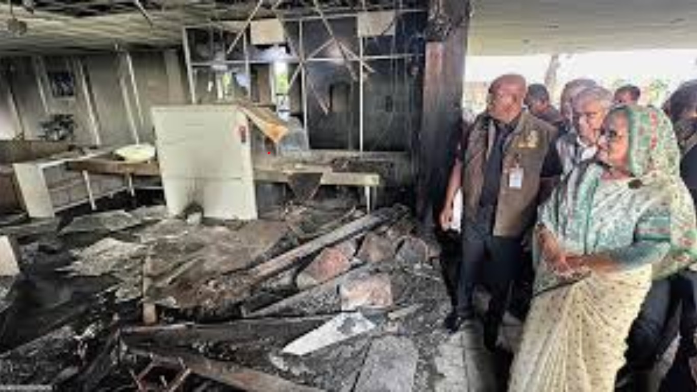 ক্ষতিগ্রস্ত বিটিভি ভবন পরিদর্শন করলেন শেখ হাসিনা