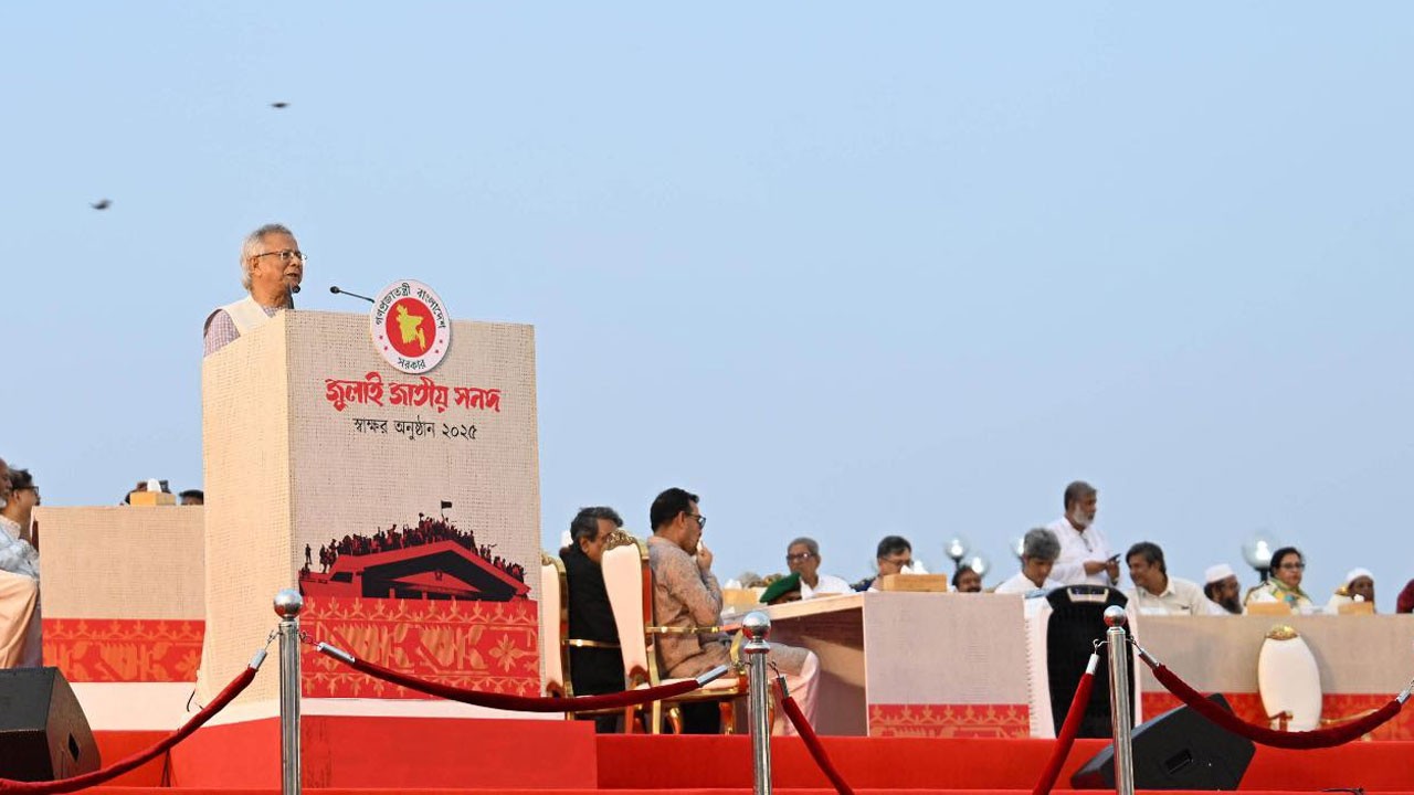 অন্তর্বর্তী সরকারের প্রধান উপদেষ্টা অধ্যাপক ড. মুহাম্মদ ইউনূস বলেছেন, জুলাই সনদ স্বাক্ষরের মাধ্যমে আমরা এক নতুন বাংলাদেশের সূচনা করলাম। এই সনদের ভিত্তিতে আমাদের সামনের দিকে এগিয়ে যেতে হবে।