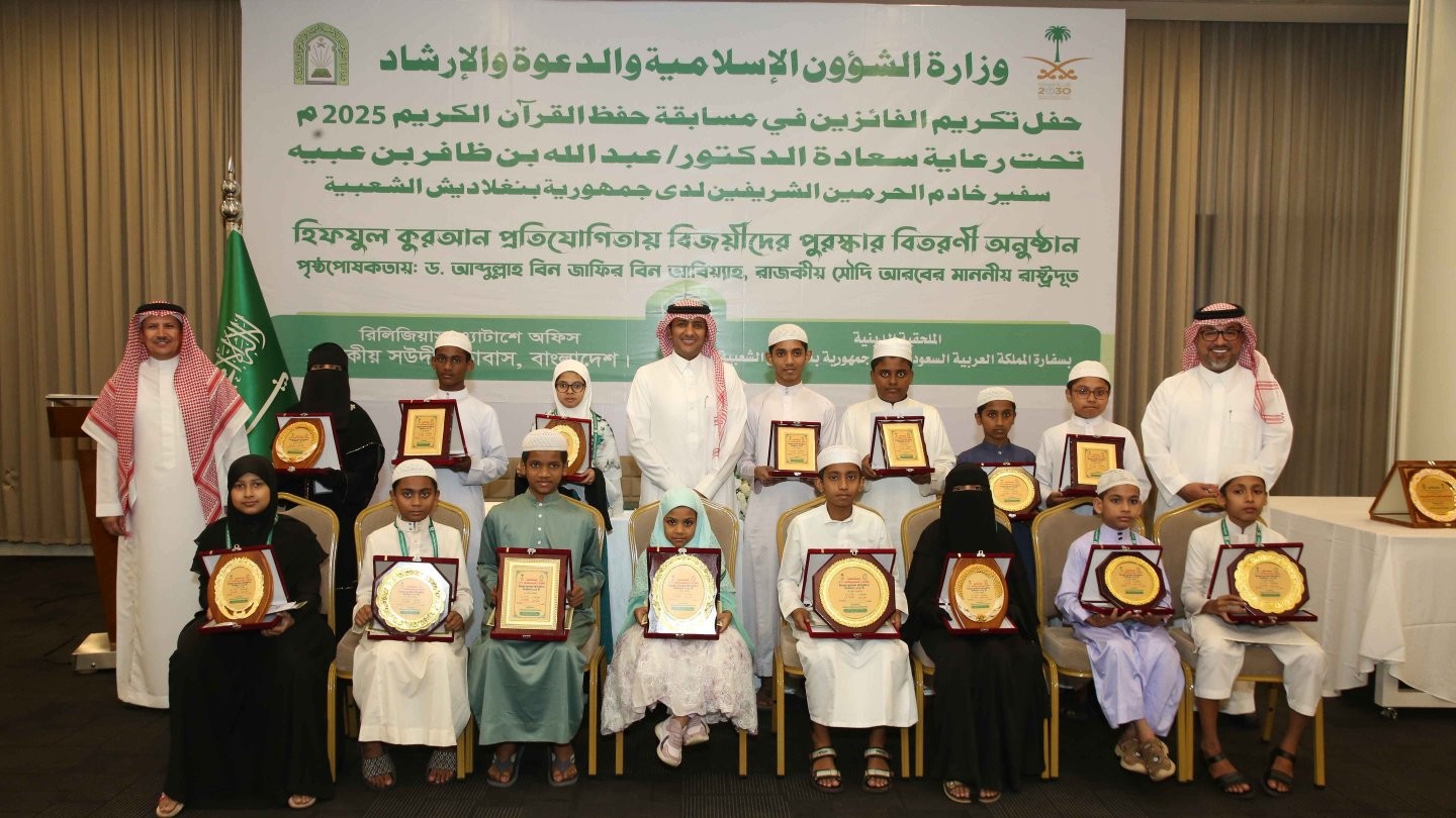 রাজধানীর বারিধারায় অবস্থিত রাজকীয় সৌদি দূতাবাসে আয়োজিত হিফজুল কোরআন প্রতিযোগিতার বিজয়ীদের মাঝে পুরস্কার বিতরণী অনুষ্ঠান মঙ্গলবার (২৮ অক্টোবর) অনুষ্ঠিত হয়।