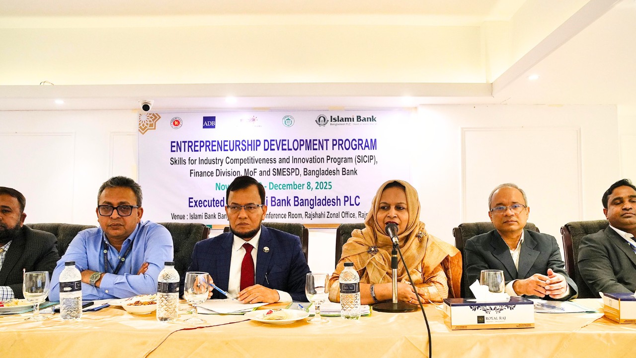 ইসলামী ব্যাংক বাংলাদেশ পিএলসি রাজশাহী জোন দেশের সম্ভাবনাময় এসএমই উদ্যোক্তাদের জন্য “উদ্যোক্তা উন্নয়ন কর্মসূচি’ ১০ নভেম্বর ২০২৫ সোমবার শুরু করেছে। এশিয়ান ডেভেলপমেন্ট ব্যাংকের অর্থায়নে অর্থ মন্ত্রণালয়ের অর্থবিভাগের স্কিলস ফর ইন্ডাস্ট্রি কম্পিটিটিভনেস অ্যান্ড ইনোভেশন প্রোগ্রাম এর আওতায় বাংলাদেশ ব্যাংকের এসএমই অ্যান্ড স্পেশাল প্রোগ্রামস ডিপার্টমেন্টের তত্ত্বাবধানে মাসব্যাপী এ প্রশিক্ষণ কর্মসুচী শুরু হয়।