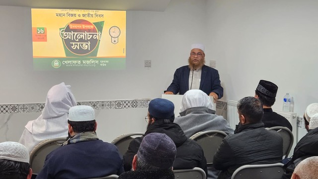 ১৬ ডিসেম্বর (মঙ্গলবার) রাত ৮টায় লন্ডনস্থ মজলিস কনফারেন্স হলে খেলাফত মজলিস যুক্তরাজ্য সাউথ শাখা আয়োজিত বিজয় দিবসের আলোচনা সভায় সভাপতির বক্তব্যে তিনি এ কথাগুলো বলেন।