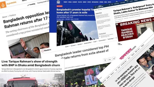 ‘১৭ বছরের নির্বাসিত জীবন শেষে বিরোধী দলীয় নেতা তারেক রহমান বাংলাদেশে ফিরেছেন’— শিরোনামের প্রতিবেদনে কাতারভিত্তিক সংবাদমাধ্যম আলজাজিরা লিখেছে, বাংলাদেশের দীর্ঘকালীন শাসক পরিবারের উত্তরাধিকারী এবং দেশের শক্তিশালী বিরোধী দলের নেতা তারেক রহমান প্রায় ১৭ বছর নির্বাসনের পর দেশে ফিরেছেন।