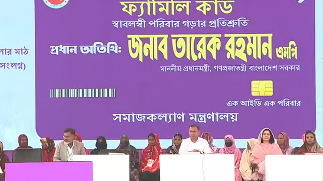 সরকার গঠনের তিন সপ্তাহের মাথায় নির্বাচনের প্রতিশ্রুতি অনুযায়ী ফ্যামিলি কার্ড কর্মসূচির উদ্বোধন করেছেন প্রধানমন্ত্রী তারেক রহমান। আজ মঙ্গলবার সকালে রাজধানীর বনানীস্থ টিঅ্যান্ডটি খেলার মাঠে (কড়াইল বস্তি সংলগ্ন) আয়োজিত এক অনুষ্ঠানে প্রধানমন্ত্রী তারেক রহমান এর উদ্বোধন করেন।