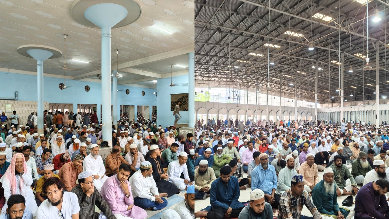 রাজধানীর বিভিন্ন প্রান্ত থেকে জাতীয় মসজিদে নামাজে অংশ নিতে ছুটে আসেন মুসল্লিরা। দুপুর ১টার দিকে মসজিদের ভেতর কানায় কানায় পূর্ণ হয়ে ওঠে।