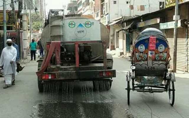 করোনা: জীবাণুনাশক পানি ছিটাচ্ছে নারায়ণগঞ্জ সিটি কর্পোরেশন
