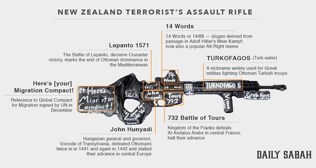 সন্ত্রাসী টরেন্টের ব্যবহৃত অস্ত্রে লিখিত ঐতিহাসিক চরিত্র ও ঘটনা