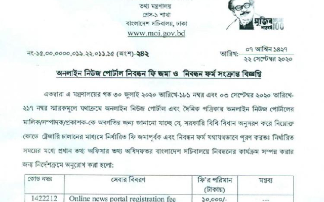 অনলাইন পত্রিকার নিবন্ধন ফি দশ হাজার: ২০ দিনের ভেতর নিবন্ধনের নির্দেশ