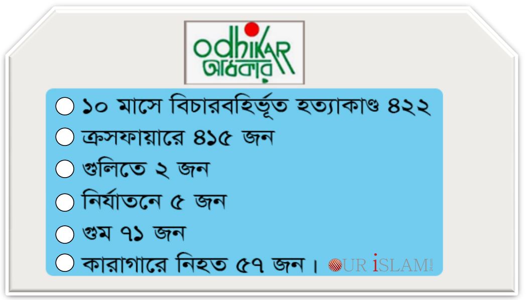 অধিকারের রিপোর্টে ১০ মাসে বিচারবহির্ভূত হত্যাকাণ্ড ৪২২