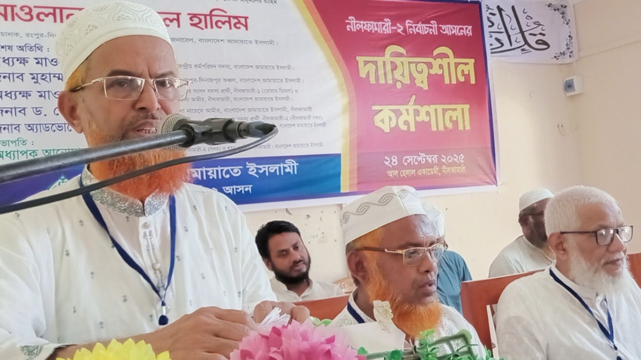 বুধবার (২৪ সেপ্টেম্বর) দুপুরে বাংলাদেশ জামায়াতে ইসলামী নীলফামারী জেলা শাখার আয়োজনে আল হেলাল একাডেমি মিলনায়তনে নীলফামারী-২ (সদর) আসনের ‘দায়িত্বশীল’ কর্মশালায় প্রধান অতিথির বক্তব্যে তিনি এসব কথা বলেন।