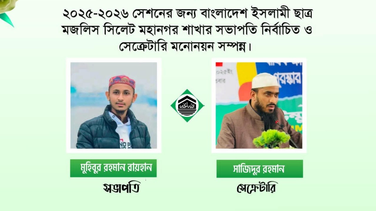 আলহামদুলিল্লাহ, আল্লাহর একান্ত মেহেরবানিতে ২০২৫-২৬ সেশনের জন্য বাংলাদেশ ইসলামী ছাত্রশিবির সিলেট মহানগরীর সভাপতি নির্বাচিত হয়েছেন মুহিবুর রহমান রায়হান ও সেক্রেটারি মনোনীত হয়েছেন সাজিদুর রহমান।