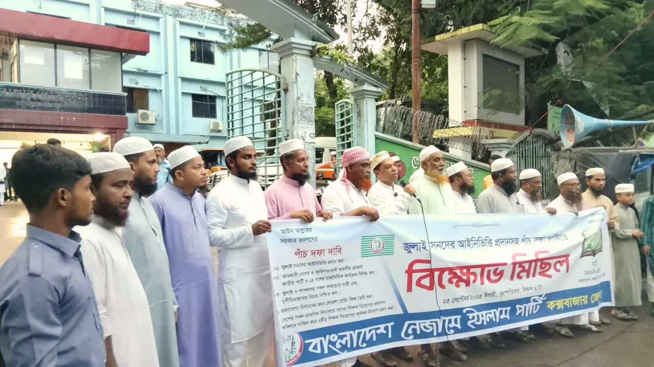 জুলাই সনদের আইনিভিত্তি প্রদানসহ পাঁচ দফা দাবিতে কেন্দ্র ঘোষিত কর্মসূচির অংশ হিসেবে বিক্ষোভ করেছে বাংলাদেশ নেজামে ইসলাম পার্টি কক্সবাজার জেলা শাখা।