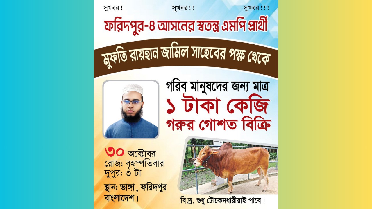 ১০ টাকায় ইলিশ দেওয়ার ঘোষণা দিয়ে দেশজুড়ে তোলপাড় সৃষ্টি করা ফরিদপুর-৪ আসনের স্বতন্ত্র এমপি প্রার্থী মুফতি রায়হান জামিলের পক্ষ থেকে এবার এক টাকা কেজি গরুর গোশত বিক্রির ঘোষণা দেওয়া হয়েছে। তবে যাদের টোকেন দেওয়া হবে তারাই এই দামে গরুর গোশত পাবে।