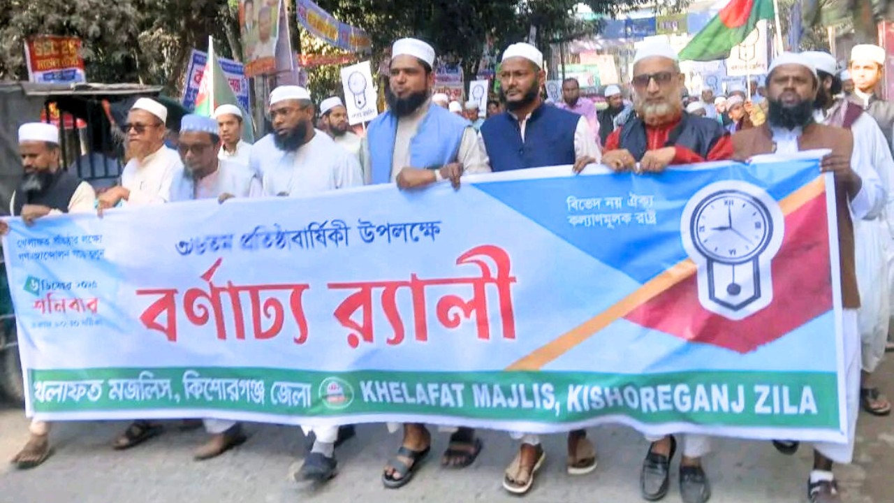 কিশোরগঞ্জ জেলা খেলাফত মজলিসের উদ্যোগে সংগঠনের ৩৬তম প্রতিষ্ঠাবার্ষিকী উপলক্ষে শনিবার (৬ ডিসেম্বর) বর্ণাঢ্য র্যালি ও সমাবেশ অনুষ্ঠিত হয়েছে।