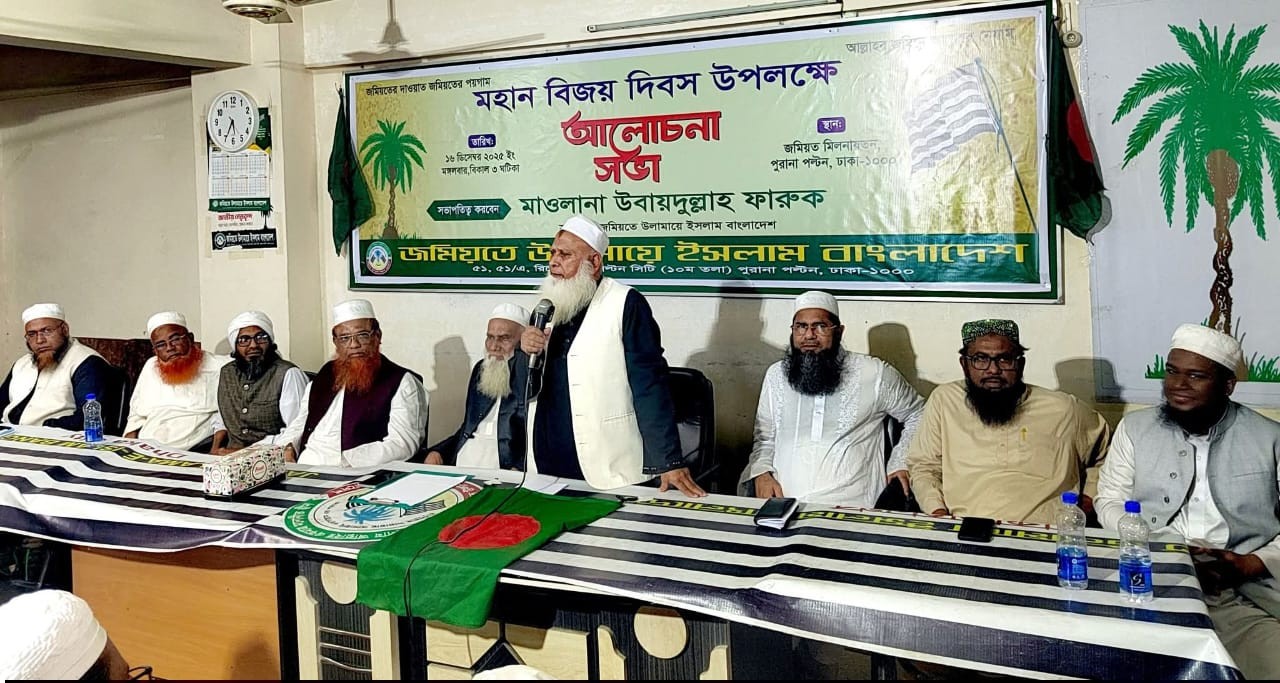 আজ মঙ্গলবার (১৬ ডিসেম্বর) বিকেলে রাজধানীর পুরানা পল্টনে জমিয়ত কার্যালয়ে মহান বিজয় দিবস উপলক্ষে আলোচনা সভায় সভাপতির বক্তব্যে জমিয়তে উলামায়ে ইসলাম বাংলাদেশের সভাপতি শাইখুল হাদিস মাওলানা উবায়দুল্লাহ ফারুক এসব কথা বলেন।