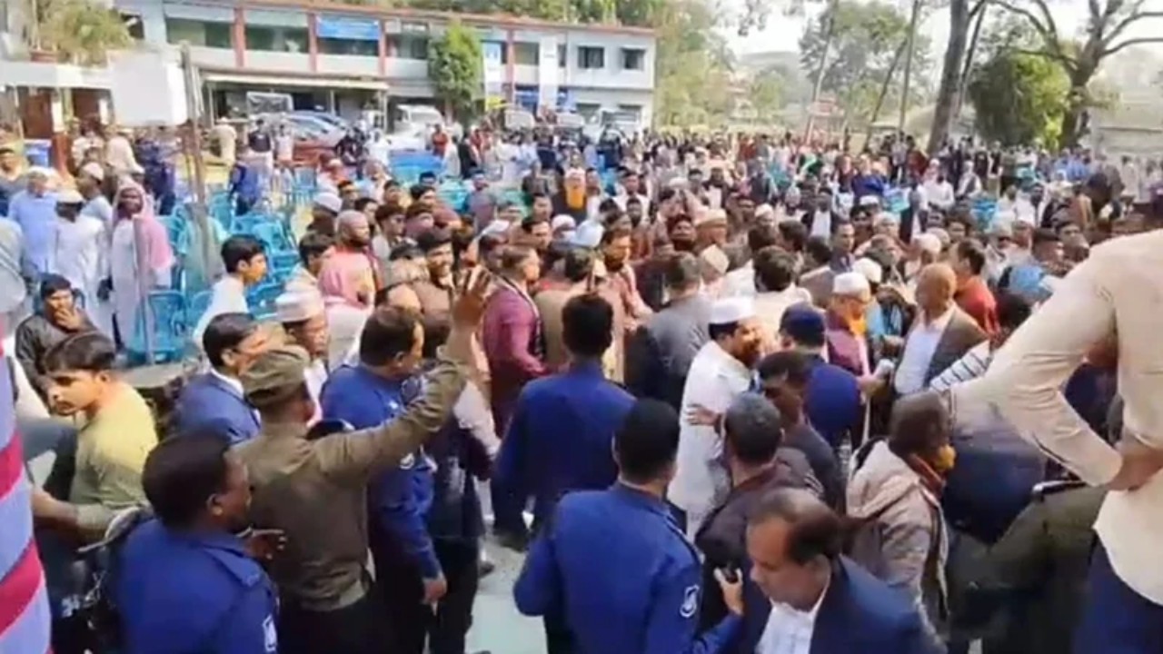 তার এ বক্তব্য শোনার সঙ্গে সঙ্গে উপস্থিত সাধারণ মানুষ ও জামায়াত সমর্থিত লোকজন ক্ষুব্ধ প্রতিক্রিয়া জানায়। মুহূর্তের মধ্যে পরিস্থিতি উত্তপ্ত হয়ে ওঠে এবং স্লোগান-পাল্টা স্লোগান শুরু হয়। পরে পুলিশের পাহারায় জাতীয় পার্টির প্রার্থীকে উপজেলা চত্বর থেকে সরিয়ে নেওয়া হয়।