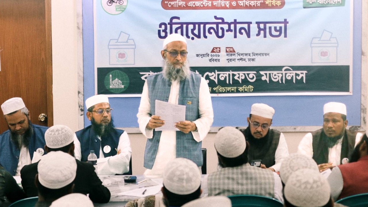 রোববার (২৫ জানুয়ারি) বেলা ১১টায় বাংলাদেশ খেলাফত মজলিসের উদ্যোগে পুরানা পল্টনস্থ দারুল খিলাফাহ মিলনায়তনে ‘পোলিং এজেন্টের দায়িত্ব ও অধিকার’ শীর্ষক এক ওরিয়েন্টেশন সভা অনুষ্ঠানে তিনি এসব কথা বলেন ।