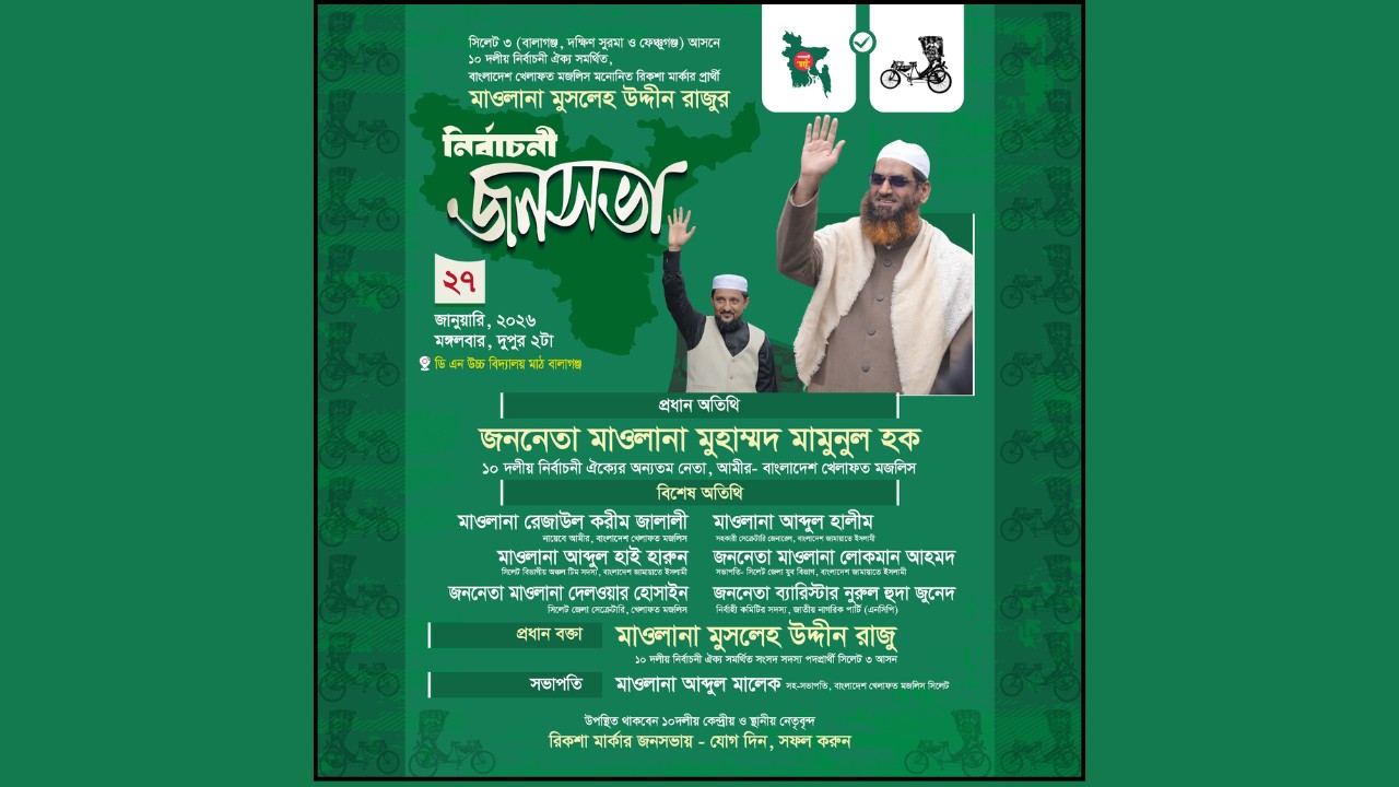 আগামীকাল মঙ্গলবার (২৭ জানুয়ারি) দুপুর ২টা বালাগঞ্জের ডি এন উচ্চ বিদ্যালয় মাঠে এই নির্বাচনী সভা অনুষ্ঠিত হবে। অনুষ্ঠানে বাংলাদেশ খেলাফত মজলিস আমির মাওলানা মামুনুল হক তার দলে প্রার্থী মাওলানা মুসলেহ উদ্দীন রাজুকে এলাকাবাসীর সামনে পরিচিত করাবেন এবং তার পক্ষে রিকশা প্রতীকে ভোট চাইবেন।