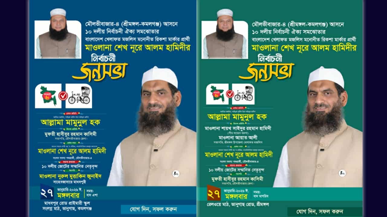 এদিকে, একই দিন মঙ্গলবার বাদ এশা কমলগঞ্জ উপজেলার মাধবপুর রোড সরকারি প্রাথমিক বিদ্যালয় মাঠে আরেকটি নির্বাচনী জনসভা অনুষ্ঠিত হবে। এতে প্রধান অতিথি হিসেবে উপস্থিত থাকবেন মাওলানা মামুনুল হক।