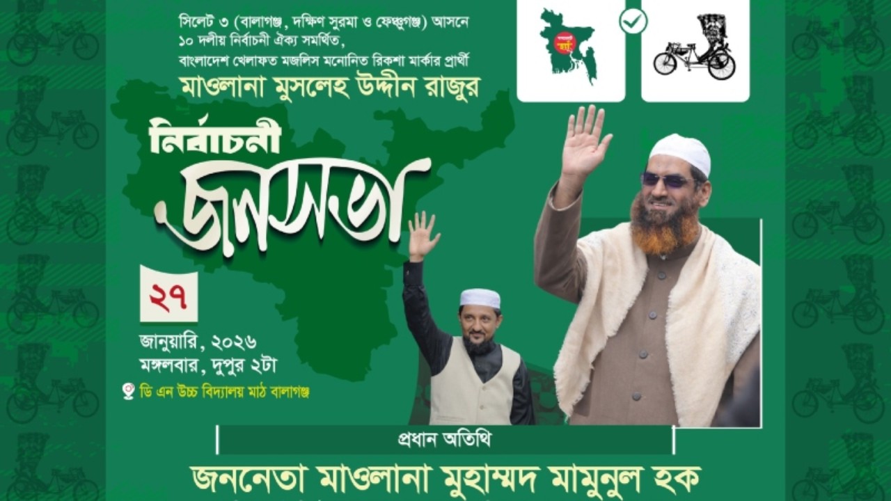 বিকেলে সিলেটের দক্ষিণ সুরমা এলাকায় একটি নির্বাচনি জনসভা অনুষ্ঠিত হবে। একইদিন বাদ মাগরিব মৌলভীবাজার জেলার কমলগঞ্জ উপজেলার ভানুগাছ এলাকায় মাধবপুর রোডস্থ প্রাইমারি স্কুল সংলগ্ন মাঠে নির্বাচনি জনসভায় বক্তব্য রাখবেন বাংলাদেশ খেলাফত মজলিসের আমীর।