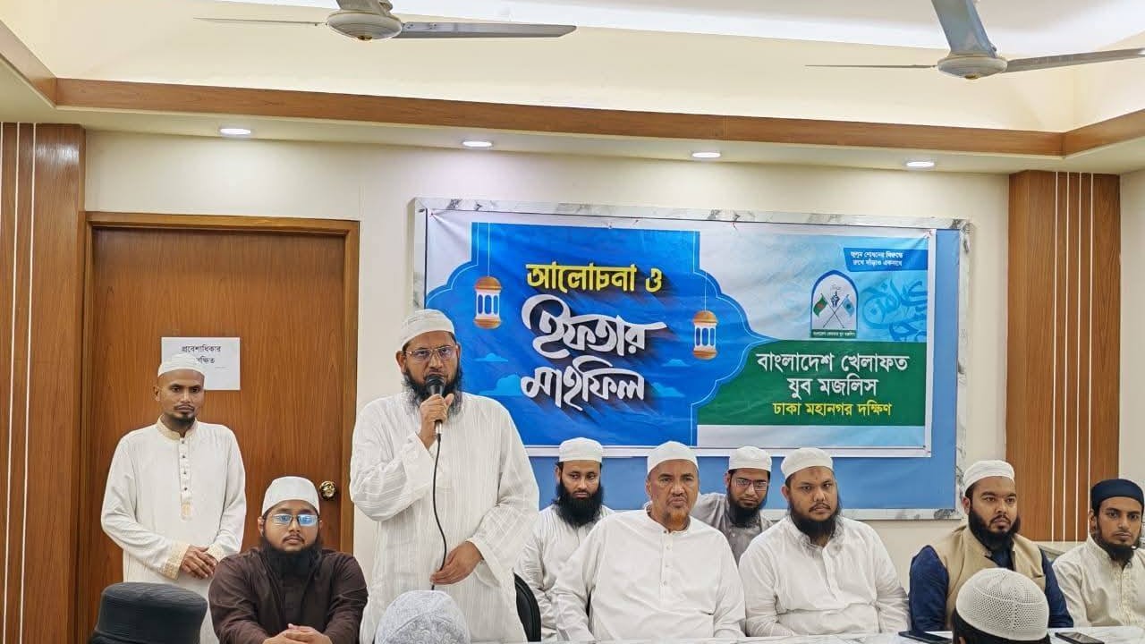 বাংলাদেশ খেলাফত যুব মজলিস ঢাকা মহানগর দক্ষিণের সভাপতি মুহাম্মাদ মিজানুর রহমানের সভাপতিত্বে এবং সহ-সভাপতি মাওলানা ওমর ফারুক মাতুব্বরের পরিচালনায় অনুষ্ঠিত ইফতার মাহফিলে প্রধান অতিথি হিসেবে বক্তব্য প্রদান করেন বাংলাদেশ খেলাফত মজলিসের মহাসচিব মাওলানা জালালুদ্দিন আহমাদ।