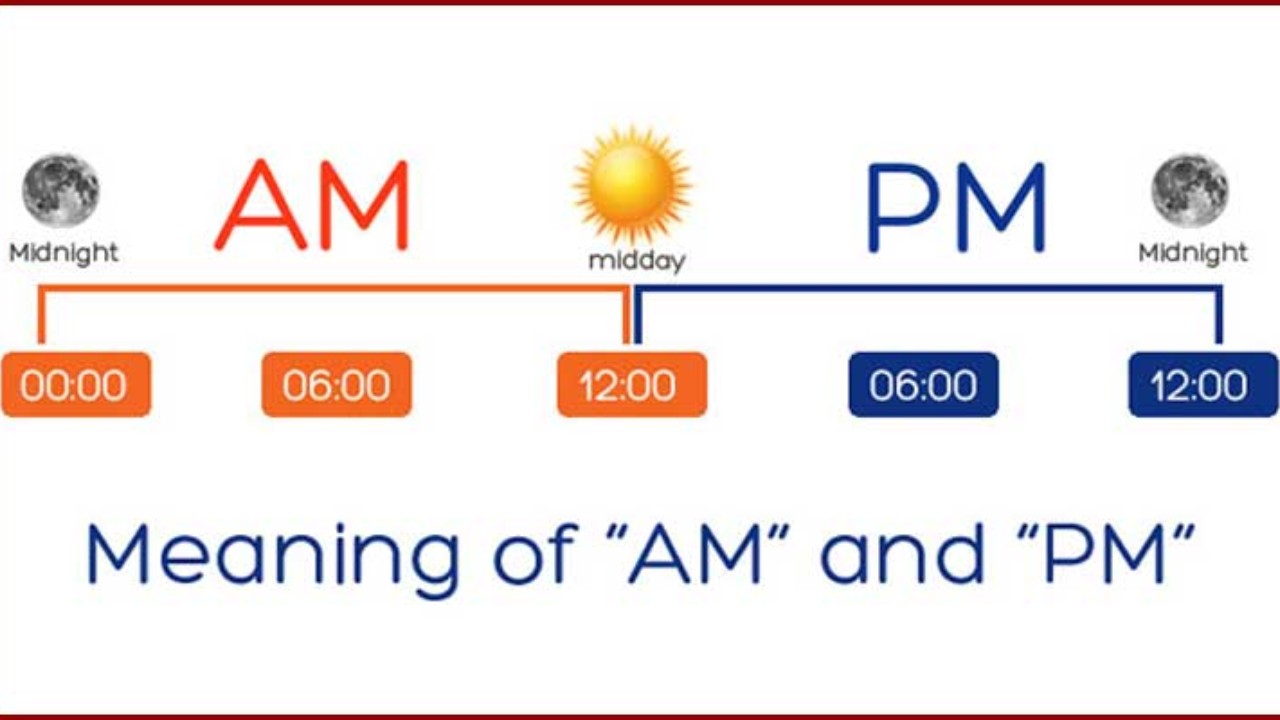 দুপুর ১২টা থেকে রাত ১২টা পর্যন্ত সময় বোঝাতে আমরা সংক্ষেপে পি.এম (pm) এবং রাত ১২টার পর থেকে দুপুর ১২টার আগ পর্যন্ত সময় নির্দেশে সংক্ষেপে এ.এম (am) ব্যবহার করি।