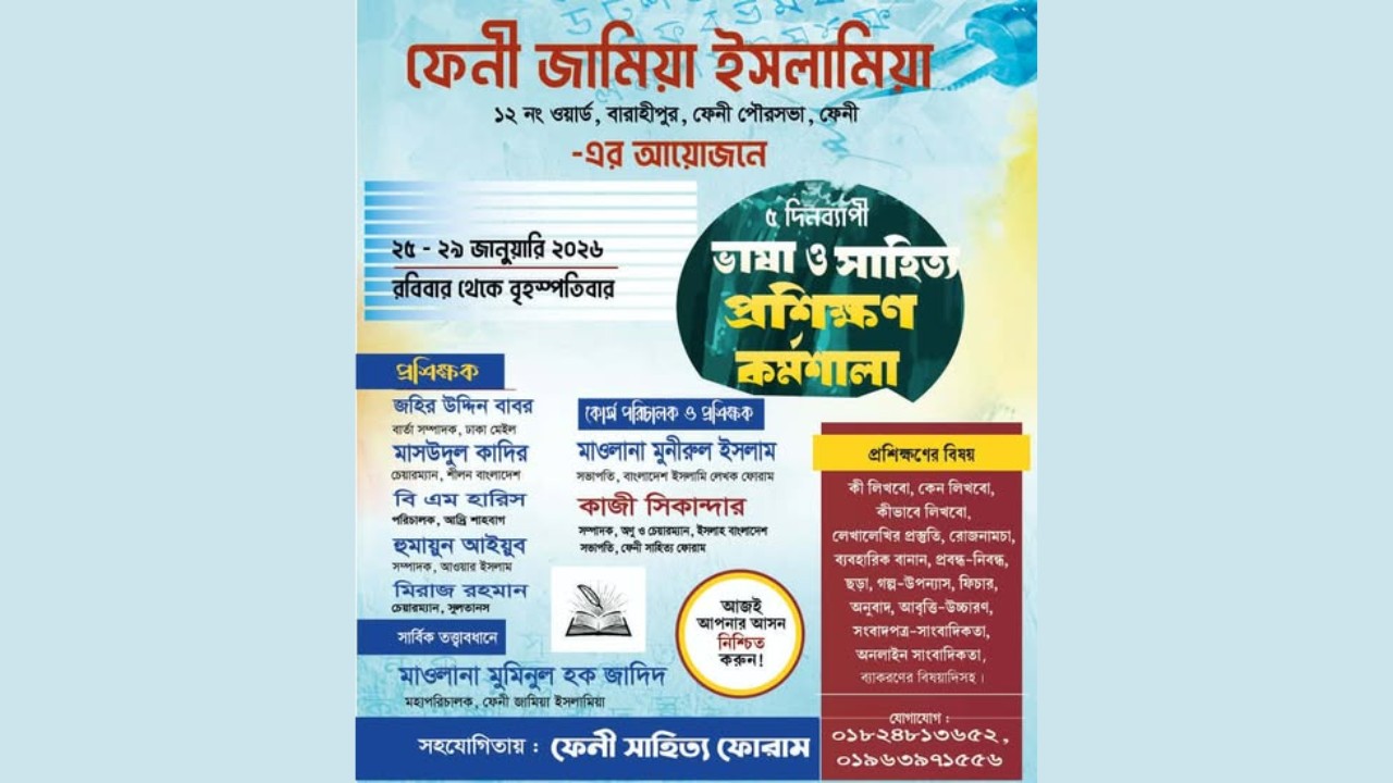 আগামী ২৫ জানুয়ারি ২০২৬ থেকে শুরু হতে যাচ্ছে ফেনী জামিয়া ইসলামিয়ায় ৫ দিনব্যাপী বাংলা ভাষা ও সাহিত্য প্রশিক্ষণ কর্মশালা। চলবে আগামী ২৯ জানুয়ারি ২০২৬ পর্যন্ত।